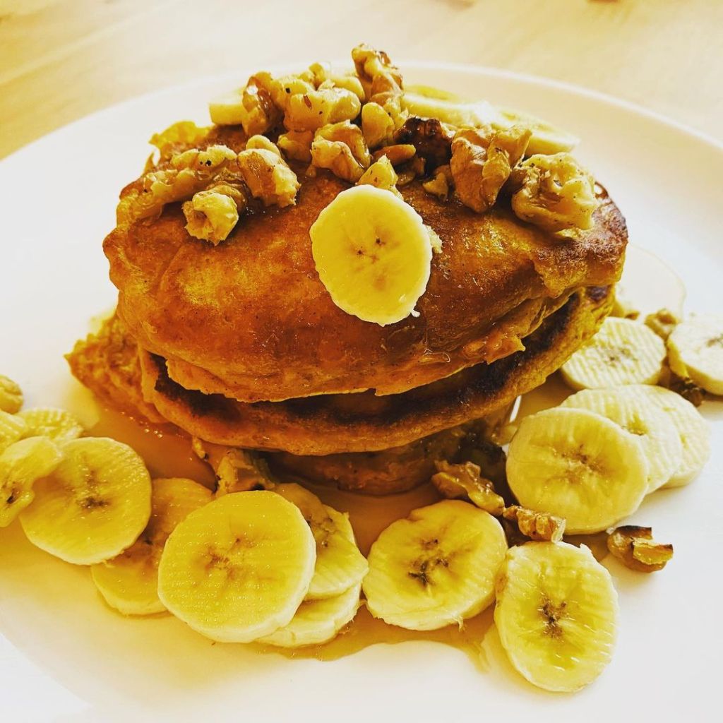 Breakfast Pumpkin Pancakes topped with roasted walnuts, maple syrup and sliced bananas Share this: Click to share on X (Opens in new window) X Click to share on Facebook (Opens in new window) Facebook Like Loading...